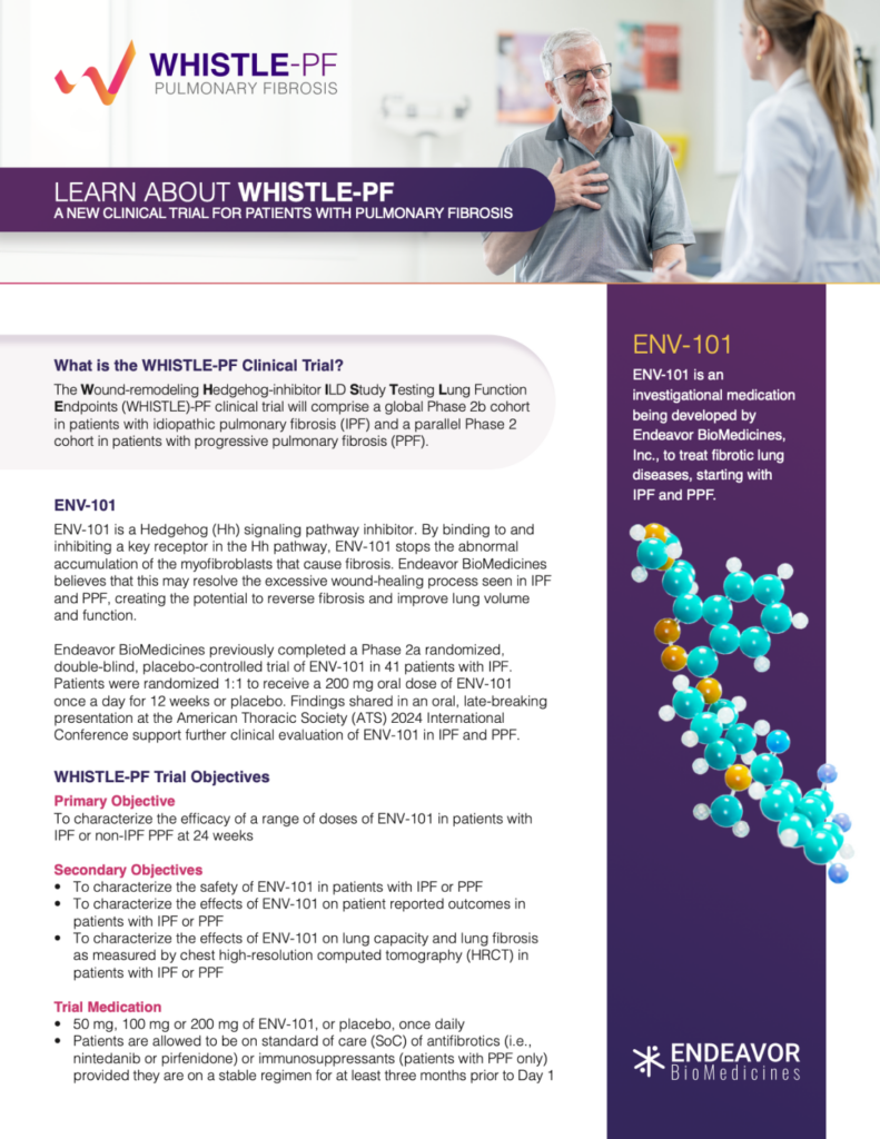 El ENV-101 es un medicamento oral que está investigando Endeavor BioMedicines, Inc. para tratar enfermedades pulmonares fibróticas, empezando por la FPI. El ENV-101 bloquea una proteína del organismo que se cree que interviene en la cicatrización pulmonar. Al bloquear este proceso, el ENV-101 puede ralentizar o invertir la FPI, lo que puede mejorar los síntomas.